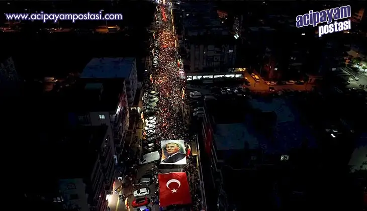 Metrelerce uzunluktaki korteje Aliağa Kaymakamı Zekeriya Güney, Aliağa Belediye Başkanı Serkan Acar, Garnizon Komutanı Albay Faruk Altun, Aliağa Cumhuriyet Başsavcısı Mehmet İmir, belediye meclis üyeleri, siyasi parti yöneticileri, sivil toplum kuruluşları ile Aliağalılar katıldı. Kortejin Avcı Ramadan Çocuk Oyun ve Rekreasyon Alanı'na varmasıyla birlikte gerçekleştirilen tekne gösterileri ilgiyle izlenirken ay yıldızlı köprüde yakılan meşaleler geceyi aydınlattı. Ellerindeki bayraklarla Avcı Ramadan Çocuk Oyun ve Rekreasyon Alanı’nı kırmızı beyaza boyayan Aliağalılar, cumhuriyetin 100. yılını büyük bir coşkuyla kutlarken drone gösterisi de geceye damgasını vurdu. Cumhuriyet Meydanı’ndan havalanan 1923 drone ile gökyüzüne Türk Bayrağı, 100. yıl logosu, 29 Ekim 1923, Türkiye Büyük Millet Meclisi, Türkiye haritası, Aliağa Belediyesi ve Atatürk silüetleri çizildi. Program sunucusu ve seslendirme sanatçısı Yunus Yeşilöz’ün sunumu ile İzmir Marşı ve 100.yıl marşı eşliğinde gerçekleştirilen gösteri izleyenlere unutulmaz anlar yaşattı. Drone gösterisini hayranlıkla izleyen Aliağalılar unutulmaz anları telefonları ile çekerek ölümsüzleştirdi.
