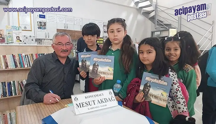 Öğrencilerin yoğun ilgi gösterdiği programda, İlahiyatçı Yazar Mesut Akdağ, "Kumdan Kaleler ve Anadolu'nun Kilidi Miryokefalon" adlı eserlerini öğrencilere tanıttı. Yazar Akdağ, "Kumdan Kaleler" isimli kitabında ele aldığı konulardan dua ve ibadet etmenin, selamı yaymanın önemine vurgu yaptı. Dua, bizi yaratan Allah'a halimizi anlatmaktır. Olmasını istediklerimizi, yalnız Allah'tan isteriz. Dertlerimizi, sıkıntılarımızı da sadece Allah'ın gidermesi için O'ndan yardım isteriz. Hem de bize vermiş olduğu nimetlere karşı bir şükür ve teşekkür ettiğimizi Allah'a bildirmemizdir. Dedi "Anadolu'nun Kilidi Miryokefalon" isimli kitabıyla ilgili olarak ta Yazar Mesut Akdağ, ‘Üzerinde yaşadığımız güzel ülkemizin ve Anadolu diye isimlendirilen topraklarımız dünyanın en güzel yurdudur. Bu güzel yurdu bizlere vatan olarak bırakan atalarımızın kahramanlığını anlatan bu hikaye kitabımızda Türk tarihimizde önemli bir savaşı anlatmak istedik. Miryokefalon Savaşı hem Türk tarihi hem de Dünya tarihi bakımından büyük bir öneme sahiptir. Bu savaşla atalarımız bu üzerinde yaşadığımız Anadolu topraklarını vatan edinmemizi kesin bir şekilde sağlamıştır. Miryokefalon Zaferi, Denizli'nin Çivril İlçesinde gerçekleştiği için Türk tarihi kadar Denizli için de ayrı bir öneme sahiptir. Bu hikaye kitabında Çivril ve tarihi ile birlikte Miryokefalon Savaşı'nı anlattık. Böylece siz değerli çocuklara hem tarihimizi hem de atalarımızın ne şartlarda bu vatanı bizlere emanet ettiklerini anlatmak istedik. Umarım bu hikaye kitabını okuduktan sonra şehitlerimize ve atalarımıza minnet borcu olarak derslerinize çalışırsınız” Dedi.
