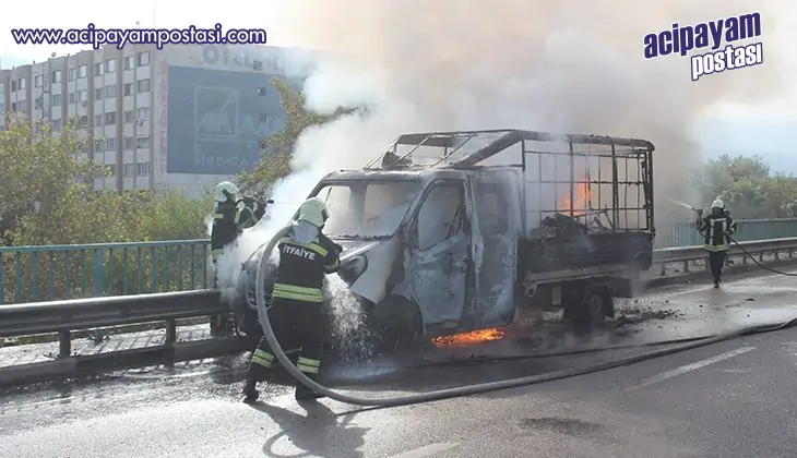 Yangın, Manisa'nın Salihli ilçesi Bülent Ecevit Köprülü Kavşak üzerinde meydana geldi. Edinilen bilgiye göre, Salihli istikametinden, Kula istikametine gitmekte olan Nevzat S. yönetimindeki 68 KC 998 plakalı kamyonet, henüz bilinmeyen bir nedenle yanmaya başladı. Sürücü Nevzat S.'nin durumu fark etmesi üzerine kamyoneti durdurarak, yolcu konumundaki yabancı uyruklu 1 kişi ile birlikte terk etti. Kamyonet kısa sürede alev topuna dönerken, çevredekiler durumu itfaiye ekiplerine haber verdi. İhbar üzerine gelen Manisa Büyükşehir Belediyesi İtfaiye Dairesi Başkanlığına bağlı Salihli İtfaiye Amirliği ekipleri yangına müdahale edip söndürdü.