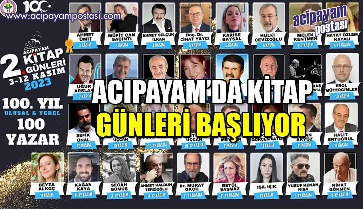 10 gün boyunca sürecek kitap günlerine Müfit Can Saçıntı, Doç. Dr. Cihat Yaycı, Hulk Cevizoğlu, Melek Kentmen, Uğur Arslan, Necdet Saraç, Jale Mutlu, Yüksel Ercan, Erol Mütercimler, Füsun Önal, Şefik Ünal, Beyza Alkoç, Betül Şaşmaz, Hayat Özlem Kayalı'nın yanı sıra Acıpayamlı ve Denizlili yazarlar kitapseverlerle buluşacak.