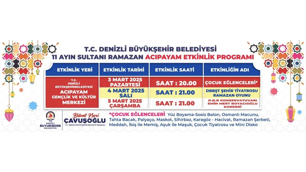 Denizli Büyükşehir Belediyesi, Ramazan ayının manevi atmosferini Acıpayam'da düzenlenecek etkinliklerle taçlandırıyor. 3-5 Mart 2025 tarihlerinde Acıpayam Gençlik ve Kültür Merkezi’nde gerçekleştirilecek etkinlikler, vatandaşlara keyifli ve unutulmaz anlar yaşatacak.