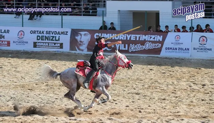 Denizli Büyükşehir Belediyesinin, Cumhuriyet’in 100. kuruluş yıldönümü kapsamında 27-28-29 Ekim’de düzenleyeceği Geleneksel Türk Spor Oyunları başladı. Denizli Büyükşehir Belediyesi Geleneksel Spor Oyunları Kompleksi’nde düzenlenen açılış programına, Denizli Büyükşehir Belediye Başkanı Osman Zolan, Pamukkale Belediye Başkanı Avni Örki, davetliler ve binlerce öğrenci katıldı. Üç gün sürecek dev organizasyon Genç Osman Atlı Spor Kulübü ile Genç Bozkuşlular Atlı Spor Kulübü arasında yapılan ata sporu cirit müsabakası ile başladı. İzleyenlerin merakla takip ettiği müsabakada atlı sporcuların birbirilerine fırlattığı ciritler büyük heyecana neden oldu, başarılı atışlar bol bol alkış aldı. Başkan Osman Zolan müsabakanın devre arasında tribünleri dolaşarak öğrencilerle bir araya geldi. Bu sırada gençler Başkan Osman Zolan’ın kendilerine hediye ettiği Türk bayraklarını açarak tribünleri adeta kırmızı beyaza boyadı. Bu sırada çalınan 10. Yıl Marşı ve İzmir Marşı ile gençlerin coşkusu zirveye ulaştı.