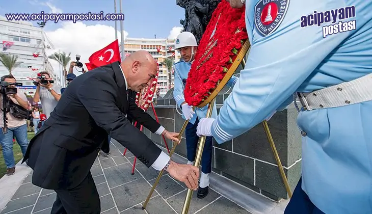 İzmir Valisi Süleyman Elban ile İzmir Büyükşehir Belediye Başkanı Tunç Soyer’in katıldığı törende Atatürk Anıtı’na çelenk bırakıldı.