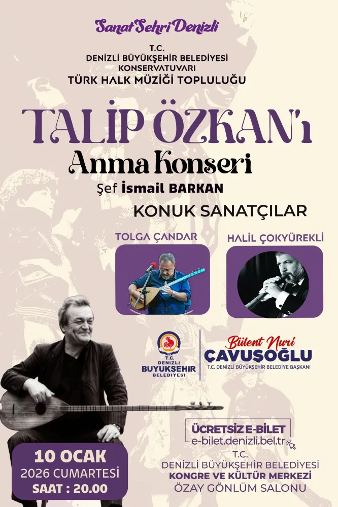 Denizli Büyükşehir Belediyesi Konservatuvarı Türk Halk Müziği Topluluğu, Şef İsmail Barkan yönetiminde “Talip Özkan’ı Anma Konseri” düzenleyecek. Bu özel konserde, Türk halk müziğinin güçlü yorumcularından Tolga Çandar, ustanın eserlerini ve Anadolu’nun kadim ezgilerini seslendirecek. Gecede ayrıca, İzmirli nefesli sazlar ustası, Ege Üniversitesi Devlet Türk Musikisi Konservatuvarı’nda zurna ve mey dersleri veren Halil Çokyürekli de sahne alarak anma gecesine katkı sunacak. Talip Özkan’ın anısına düzenlenen konser,10 Ocak 2026 Cumartesi günü saat 20.00’de Denizli Büyükşehir Belediyesi Kongre ve Kültür Merkezi Özay Gönlüm Salonu’nda gerçekleştirilecek. Ücretsiz olarak gerçekleştirilecek konserin biletleri e-bilet.denizli.bel.tr adresinden temin edilebilecek.