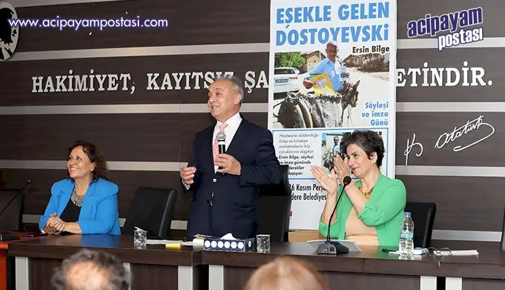 Açılış konuşmalarının ardından Narlıdereli vatandaşlara ‘Eşekle Gelen Dostoyevski’nin hikâyesini anlatan Ersin Bilge, köy okulunda okurken kalemi ve defteri olmadığı için öğretmeni tarafından azarlandığını ifade ederek, “Erzincan'ın Çayırlı ilçesi Yukarıkartallı köyünde kısıtlı imkânlarla büyüyen bir çocukken daha sonra Almanya’ya yerleştim. Ancak aklım hep buradaydı. Hayalim kendi ülkemde benim gibi zor şartlarda yetişen çocuklara yardımcı olabilmekti. Hayalimi gerçekleştirdim ve ailemin de desteğiyle şimdiye kadar 7 bin öğrenciye kitap-kırtasiye malzemesi dağıttım. Yurtdışından dostlarımızın da yardımlarıyla 75 üniversite öğrencimize burs imkânı sağladım. Köy Enstitüsü ruhuna sadık kalan bir insanım. Şu ana kadar dokunduğumuz çocuklardan biri hukukçu, savcı, doktor, bilim insanı olursa hele bir de yarın bir gün Nobel alırsa dünyanın en mutlu insanı ben olurum. Biz sevgimizi çevremizdeki insanlara açmak zorundayız. Sizlere de tavsiyem çocuklarınızın hayallerine asla engel olmayın” diye konuştu. Ersin Bilge’nin idealist yönüne dikkat çeken Narlıdere Belediyesi Pakize Ateş Kadın Danışma Merkezi Müdürü Semra Pektopal da “Ersin Bilgeler çoğalsın istiyoruz. İnanıyoruz ki kitapla buluşan o çocuklar, yarının en önemli insanları olacaklar” açıklamasında bulundu. Söyleşi; plaket, çiçek takdimi ve Ersin Bilge’nin Eşekle Gelen Dostoyevski kitabını imzalamasıyla sona erdi.