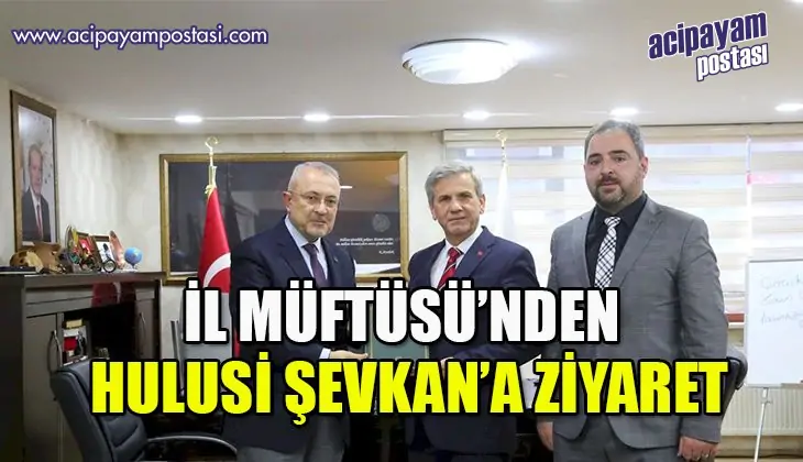 Denizli İl Müftüsü Abdullah Pamuklu ve Acıpayam İlçe Müftüsü Hüseyin Sözen, Acıpayam Belediye Başkanı Dr. Hulusi Şevkan'ı ziyaret etti. Şevkan ziyarete ilişkin sosyal medya hesabından şu sözleri paylaştı: " İl Müftümüz Sn.Abdullah Pamuklu hocam ve İlçe Müftümüz Hüseyin Sözen hocama nazik ziyaretlerinden dolayı teşekkür ediyorum"