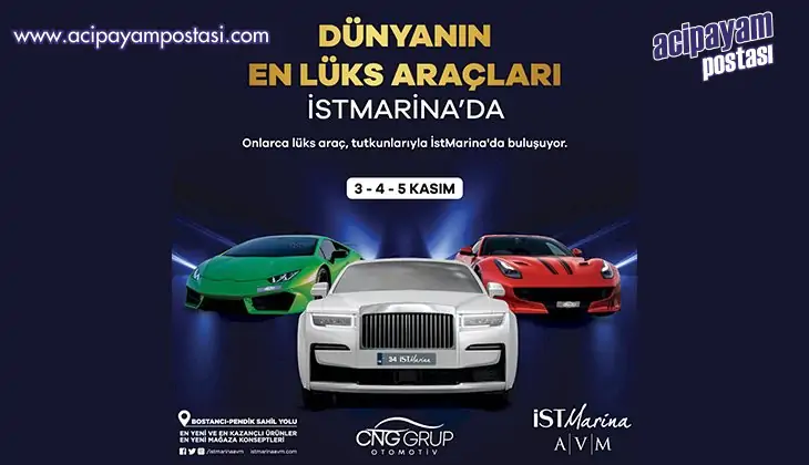 ‘Deniz üstü alışveriş’ tarzıyla perakende sektörüne yeni bir boyut getiren, Anadolu Yakası’nın sahil cephesi en geniş, açık alan alışveriş merkezi İstMarina AVM, dünyanın en lüks otomobillerini 3-5 Kasım tarihleri arasında ziyaretçileri ile buluşturacak. İstMarina AVM ziyaretçileri, dünyanın en pahalı araba modelleri arasında kabul edilen yenilikçi, özgün ve mükemmel tasarımlarıyla dikkat çeken lüks otomobilleri, üç gün boyunca yakından inceleme fırsatı bulacak.